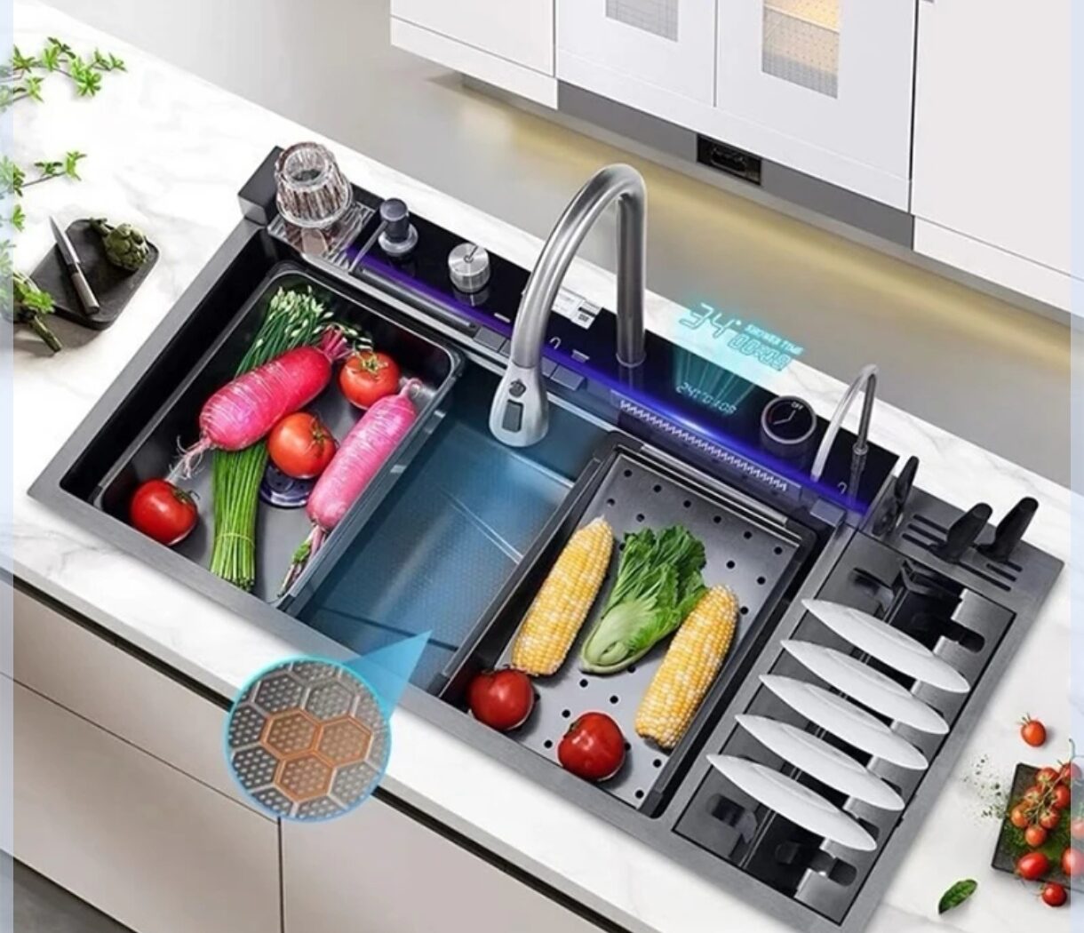 یکی از مزیتهای مهم این مدل، همراهداشتن اکسسوریهای کاربردی است. تخته کار استیل، لگن سبزیشور، سبد میوهشور، لیوانشور با مغزی برنجی و جامایع پمپی بخشی از این تجهیزات هستند که تجربه آشپزی و شستوشو را حرفهایتر میسازند.