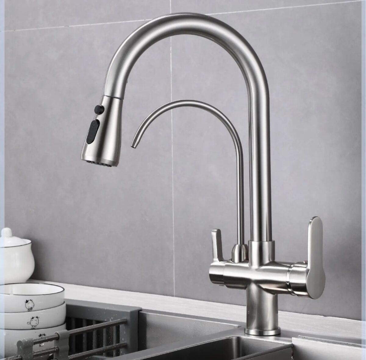 مهمترین ویژگی این شیر، وجود شیر تصفیه آب داخلی با اهرم مجزاست. دیگر نیازی به سوراخکاری جدید روی سینک ندارید و میتوانید بدون آسیب به سطح سینک، از آب سالم و تصفیهشده استفاده کنید.